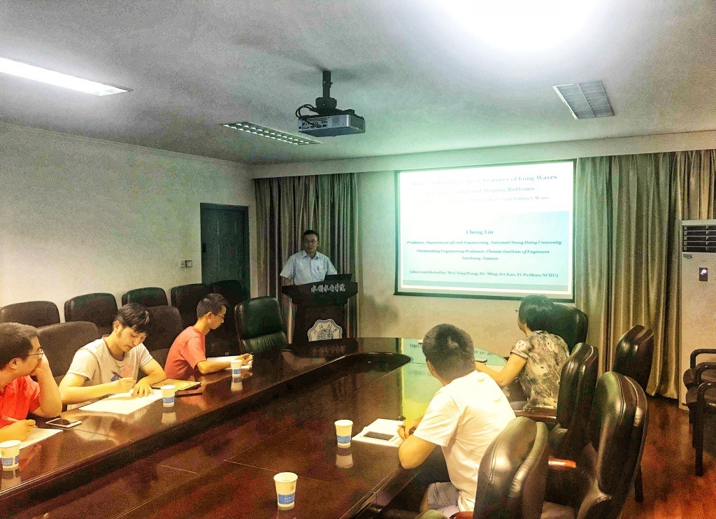 2018年6月27日下午3点,台湾中兴大学林呈教授应邀为亚洲情色 师生作了题为“Flow characteristics of undular bores propagating over horizontal and sloping bottoms”的学术报告。林呈教授长期从事海洋动力结构物理模拟实验研究。现担任海洋科学与技术国际期刊(Journal of Marine Science and Technology)编辑、水动力学国际研讨会执行委员、亚洲地区可视化国际研讨会执行委员、美国土木工程学会工程力学研究所紊流工作委员会委员、中国土木水利工程学会理事、中国工程师学会中区分会理事、台湾海洋工程学会理事等职务,有极高的学术造诣。报告由王玲玲老师主持,学校相关专业老师与研究生共四十余人参加了报告会。