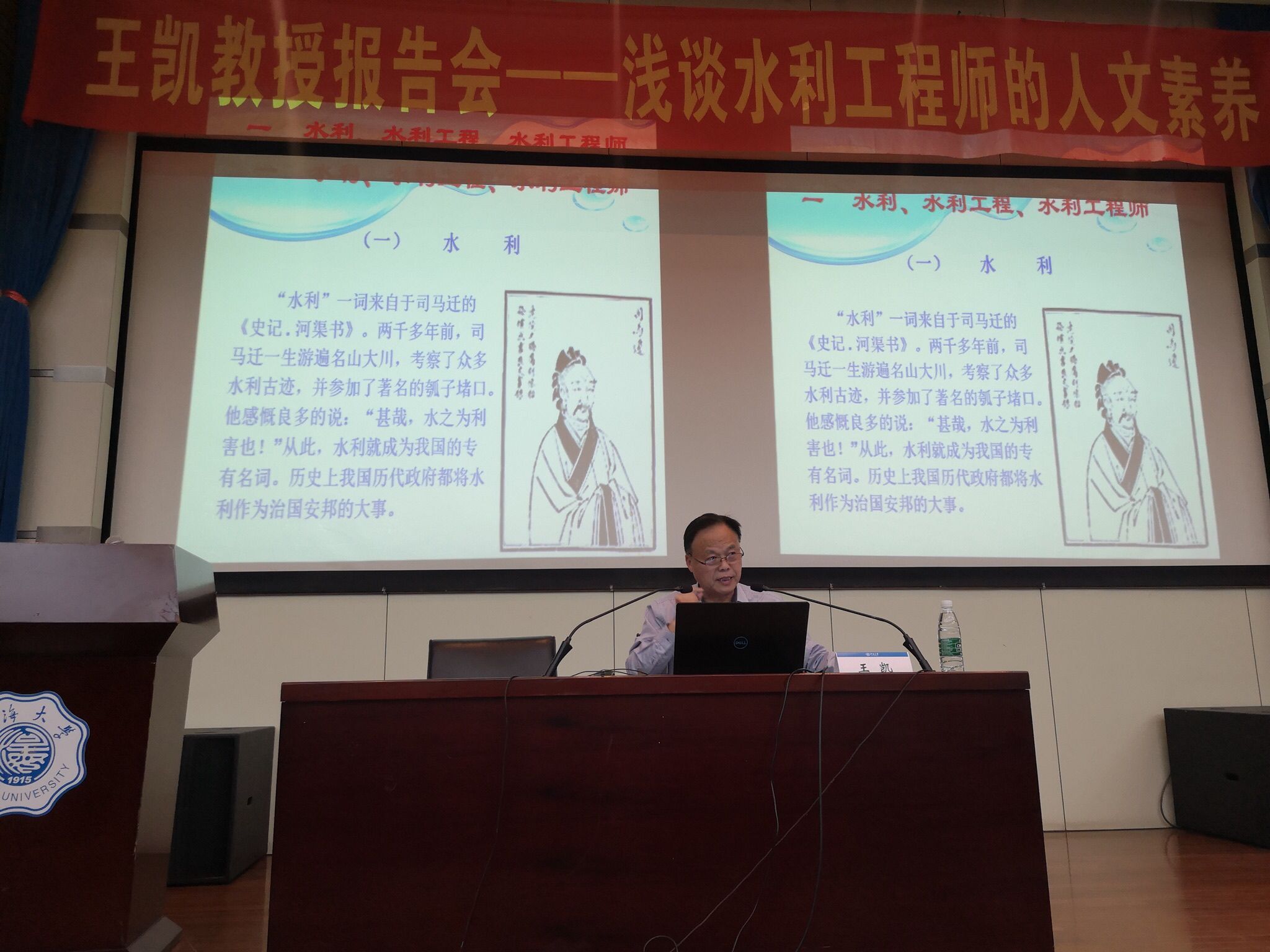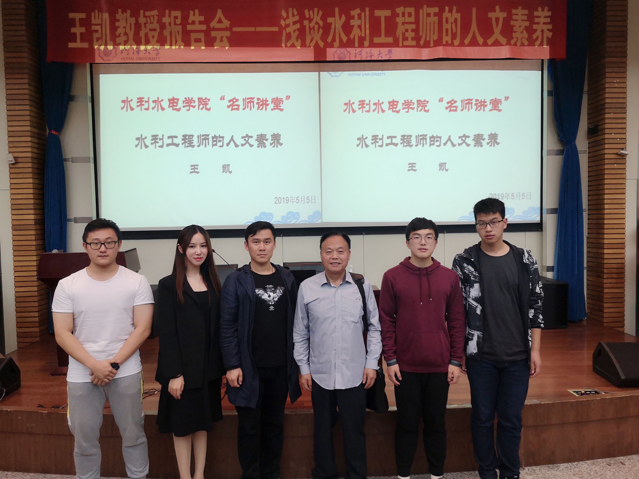 杰出校友、兼职教授王凯为水电院、水文院和港航院2018级本科生作了一场题为“水利工程师的人文素养”的报告会,本次报告会由2018级辅导员姜帆主持。