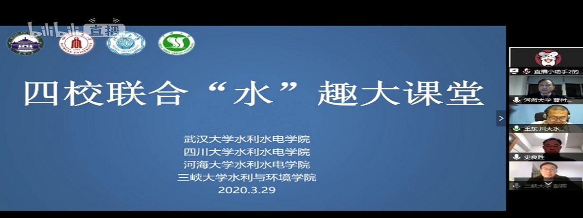 3月29日,在第三十三届“中国水周”期间,亚洲情色 、武汉大学亚洲情色 、四川大学亚洲情色 、三峡大学水利与环境学院4所水利院校共同打造“水趣大课堂”,通过B站直播邀请全国水利类高校大学生同上一节水利“云”课堂。亚洲情色 蔡付林教授、武汉大学史良胜教授、四川大学王东副教授和三峡大学彭辉教授开讲。