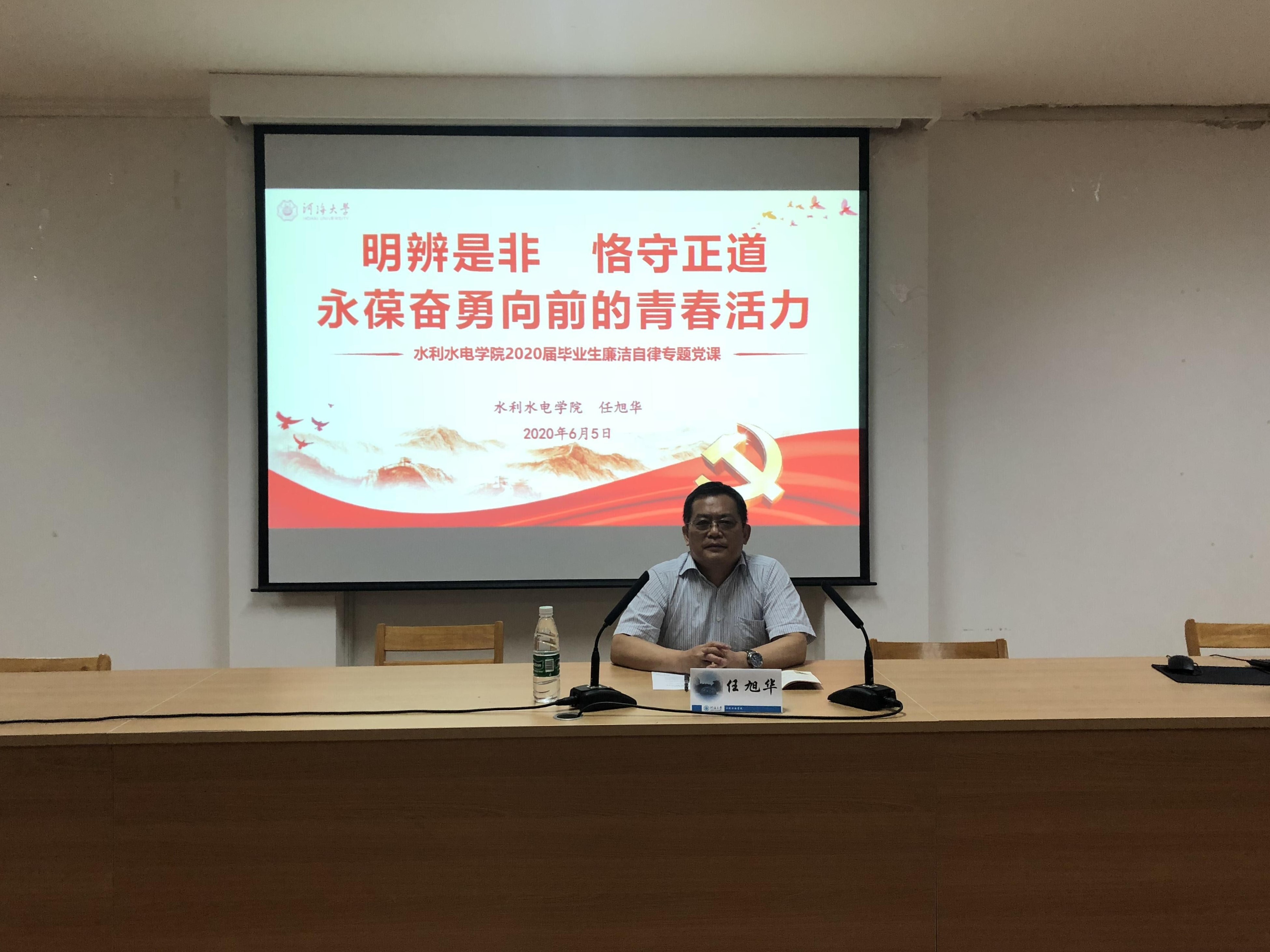 6月5日,亚洲情色 党委书记任旭华以《明辨是非,恪守正道,永葆奋勇向前的青春活力》为题,为全体2020届毕业生讲授廉洁自律专题党课。此次党课以线上线下相结合的方式举办,毕业生党员共126人在水电馆401会议室参加党课,毕业研究生和本科毕业生共253人在线上收听党课。