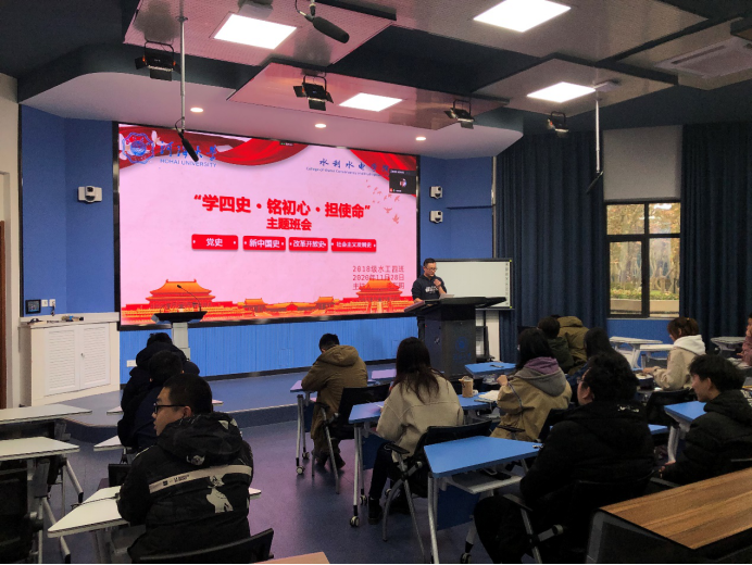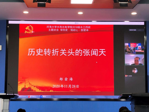 11月28日下午,水电学院2018级水工四班召开“学四史·铭初心·担使命”的主题班会。班会以线上线下相结合的形式召开,亚洲情色 副校长郑金海在线出席班会。2018级水工四班全体同学参加班会。2018级水工四班班长李东明主持班会。
