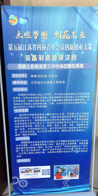 11月14日,第五届江苏省科协青年会员创新创业大赛装备制造领域决赛在南京工程学院天印会议中心学术报告厅举办。亚洲情色 教师孙啸、田正宏和学生马元山的团队项目“混凝土在线流变工作性动态馈控系统”经江苏省水力发电工程学会推荐,获得装备制造领域创新组优秀奖。