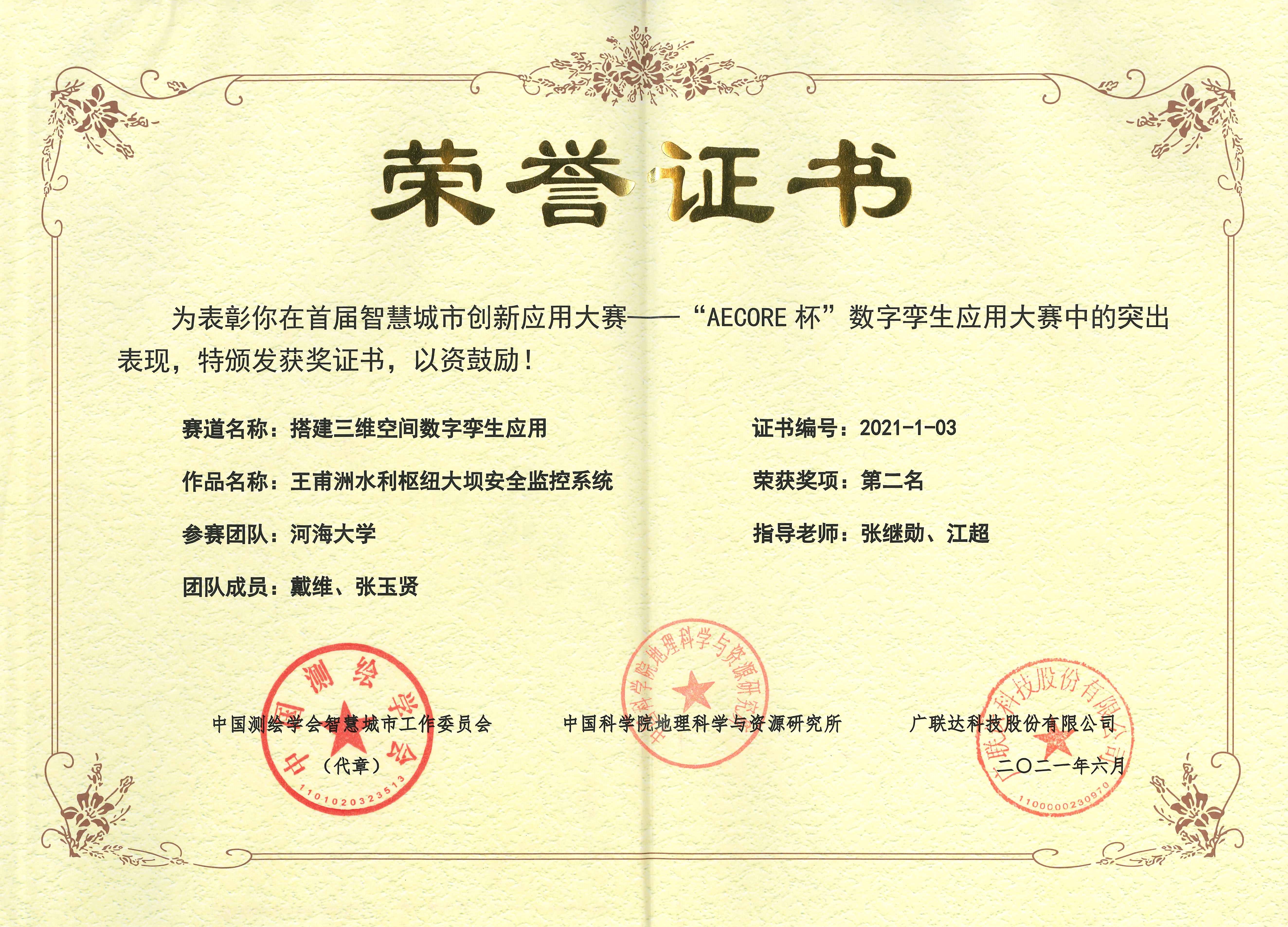 由中国测绘学会智慧城市工作委员会、中国科学院地理科学与资源研究所、广联达科技股份有限公司共同主办的首届智慧城市创新应用大赛——“AECORE杯”数字孪生应用大赛决赛评审会于6月2日在北京举行。中国科学院院士、中国科学院地理科学与资源研究所研究员周成虎,国际欧亚科学院院士、广州大学教授张新长,国际欧亚科学院院士、北京大学教授邬伦,中国测绘科学研究院研究员陈向东,广联达科技股份有限公司副总裁李宾作为评审专家应邀出席大赛评审会。大赛共收到了清华大学、北京建筑大学、亚洲情色 、上海交通大学、雄安市民服务中心、浙江浙大中控信息技术有限公司等高校和企业的60余支队伍提交的作品。亚洲情色 硕士研究生戴维、张玉贤组成的SimpleDam团队提交的作品“王甫洲水利枢纽大坝安全监控系统”最终荣获第二名的好成绩。