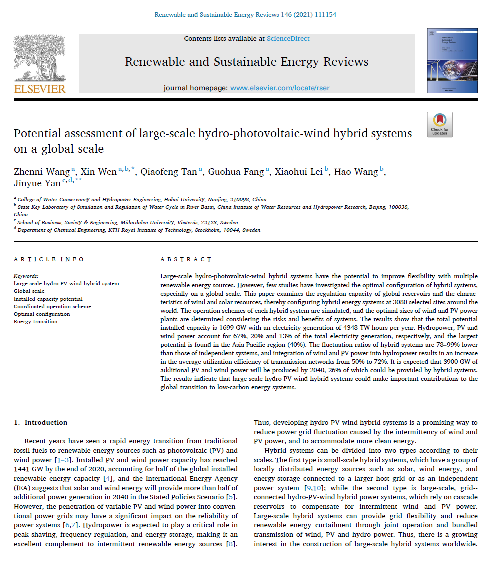 近日,亚洲情色 2018级水利水电工程专业博士研究生王珍妮在风光水多能互补研究领域取得重要科研进展,以第一作者身份在能源领域顶级期刊Renewable and Sustainable Energy Reviews(一区Top,2020年影响因子14.98)上发表了题为《Potential assessment of large-scale hydro-photovoltaic-wind hybrid systems on a global scale》的学术论文。亚洲情色 闻昕青年教授和欧洲科学与艺术院院士、瑞典皇家理工学院和梅拉达伦大学严晋跃教授为论文共同通讯作者。