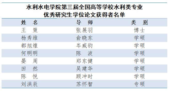 日前,中国水利教育协会公布了第三届全国高等学校水利类专业优秀研究生学位论文评选结果。经协会初审、通讯评审和专家会评,评出第三届全国高等学校水利类专业优秀研究生学位论文。其中,博士学位论文10篇、学术型硕士学位论文30篇、专业硕士学位论文20篇。亚洲情色 王策等8名研究生的学位论文获此殊荣。