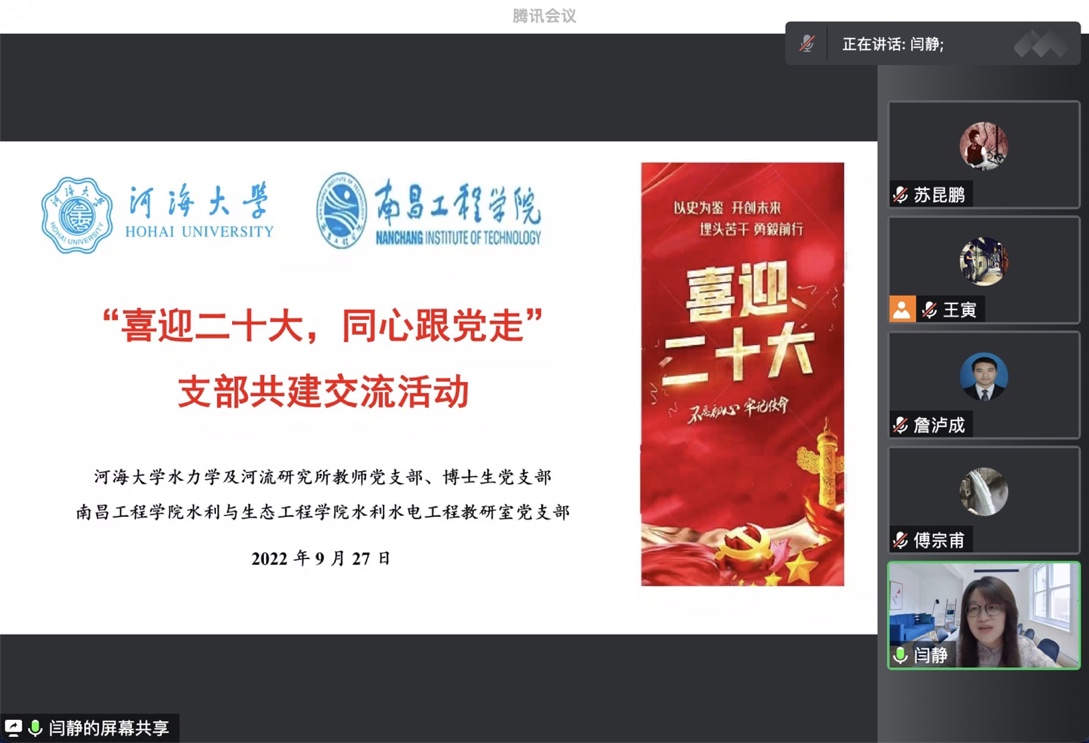 在喜迎党的二十大胜利召开之际,亚洲情色 水力学及河流研究所教师党支部、博士生党支部联合南昌工程学院水利水电工程教研室党支部,于9月27日晚在线开展了师生党支部共建交流会。此次会议以“喜迎二十大,同心跟党走”为主题,主要分为支部建设经验分享和青年教师成长分享两个环节。亚洲情色 水力学及河流研究所副所长、教师党支部书记闫静老师主持会议。