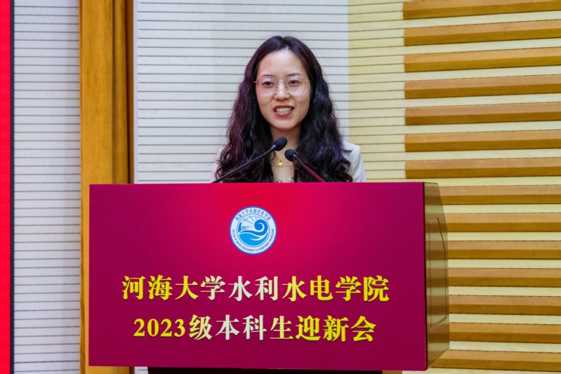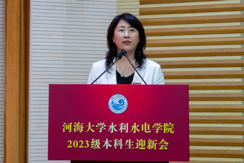 王媛院长对329名新生的加入表示由衷祝贺和热烈欢迎。她从学院悠久历史、师资人才队伍、学科发展与建设和重要科研成果等方面介绍了学院雄厚的办学实力、丰硕的科研成果和杰出的校友代表。王媛院长对2023级新生们提出三点要求:一是立德为本,信念坚定,增强人生道路的“使命感”。二是行健不息,力克挑战,追寻大学生活的“价值感”。三是敢于担当,锐意进取,强化使命在肩的“责任感”。她勉励同学们铭记河海校训,扬水利精神,做中流砥柱。愿同学们赓续前辈血脉,成就未竟事业,谱写属于自己、属于河海、属于国家、属于全人类的崭新华章!