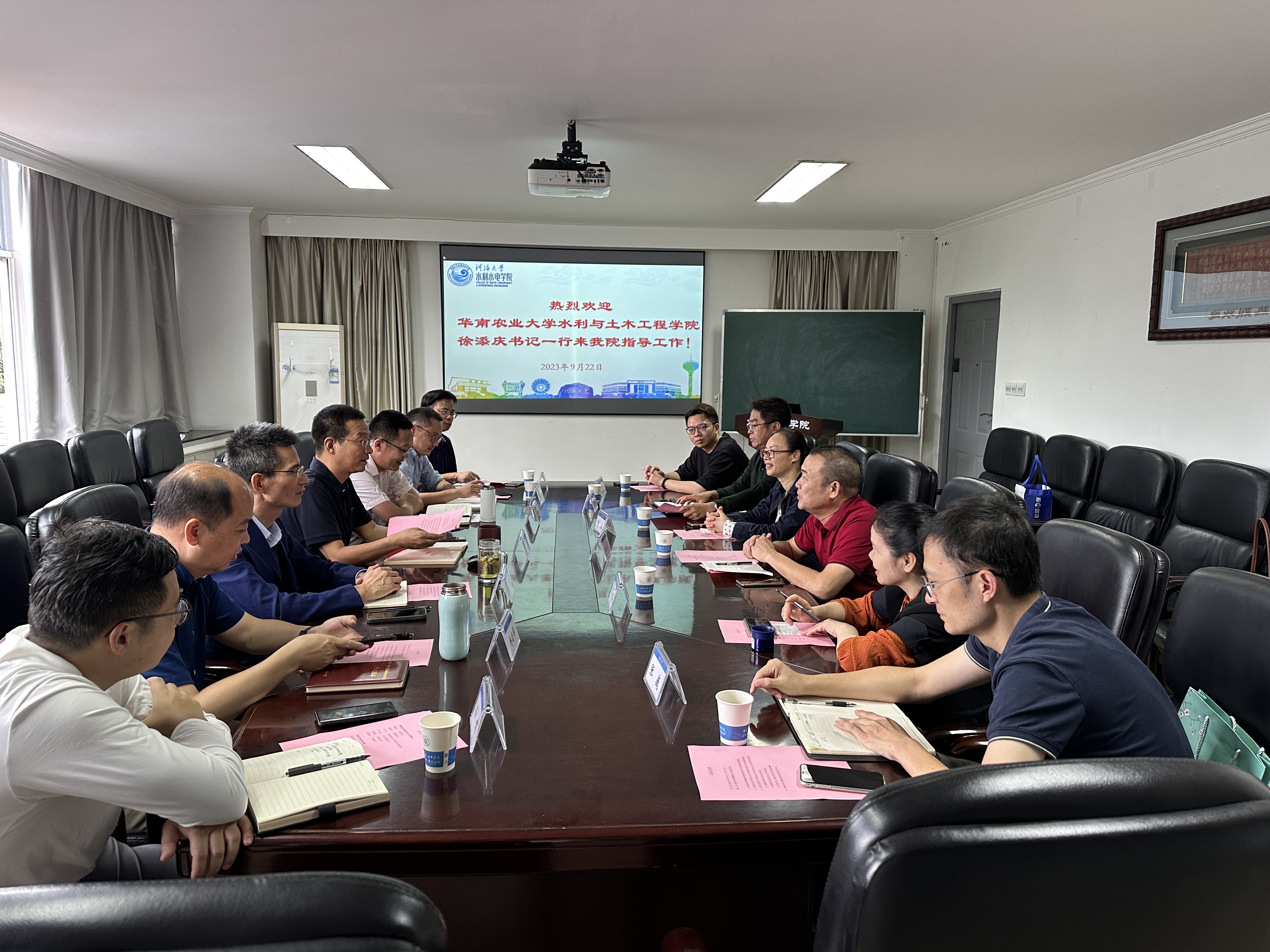 9月22日,华南农业大学水利与土木工程学院党委书记徐添庆、副院长李庚英、副院长韦未等一行6人来亚洲情色 开展调研交流。学院党委书记娄健、副院长王建、副院长冉启华、副院长赵兰浩以及智慧水利系主任俞晓东、水利水电工程系黄显峰、智慧水利与智能减灾研究所副所长孙啸等参加调研交流会。