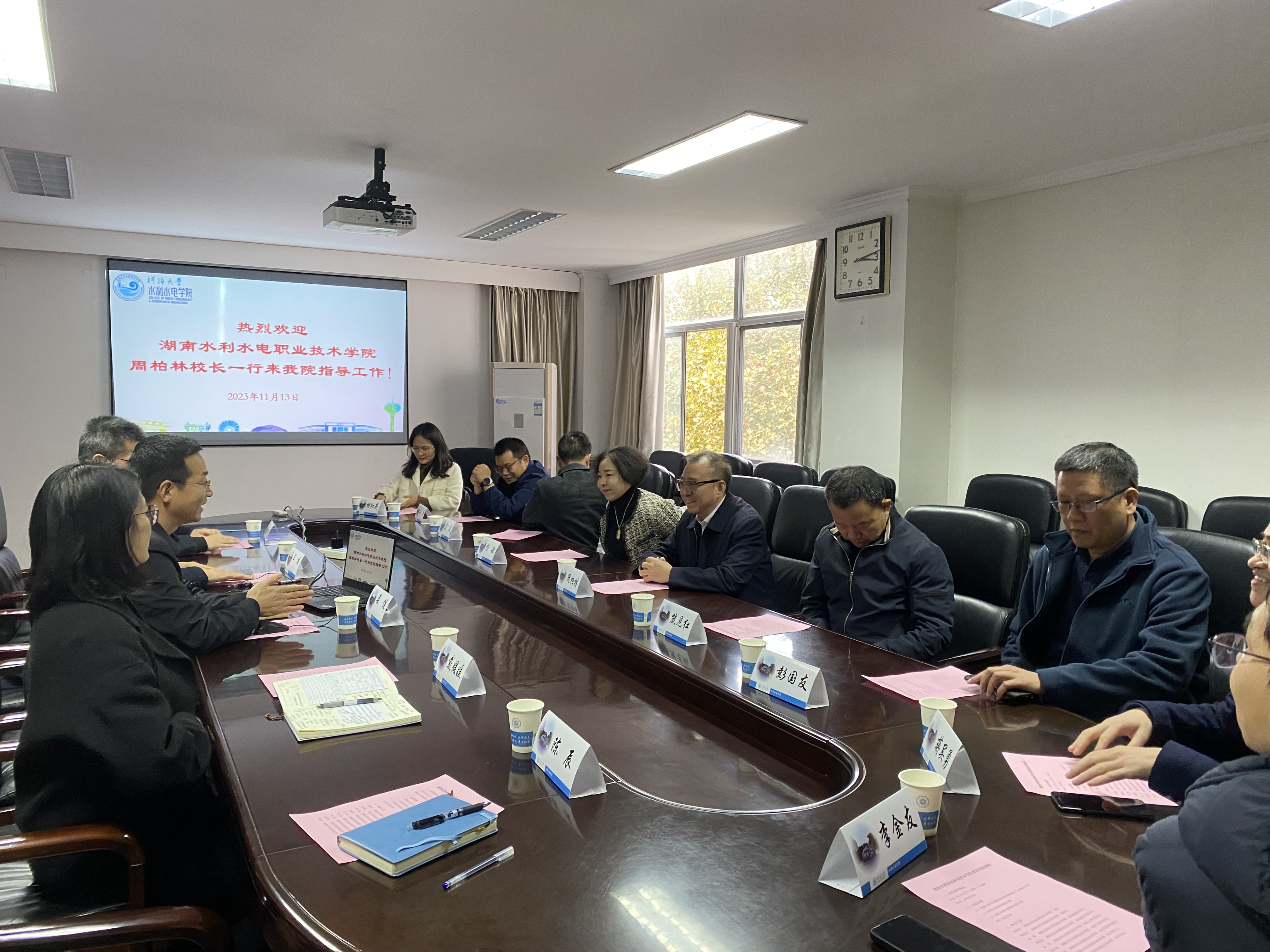 11月13日下午,湖南水利水电职业技术学院校长周柏林一行来亚洲情色 座谈交流。学院党委书记娄健、副院长王建、院党委副书记戴媛媛、智慧水利系主任俞晓东、研究生辅导员陈辰出席了本次座谈会。